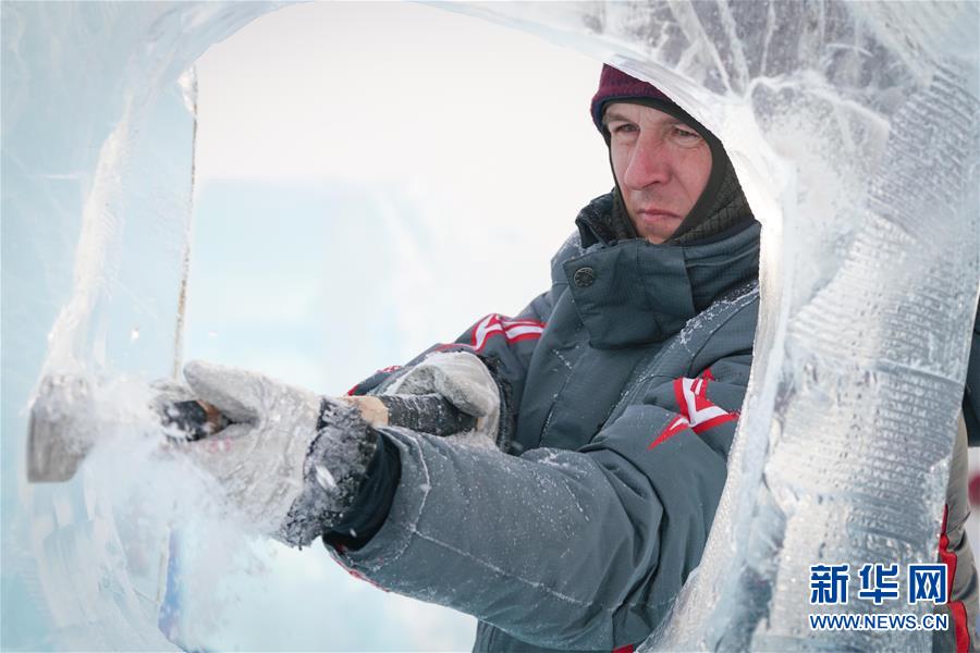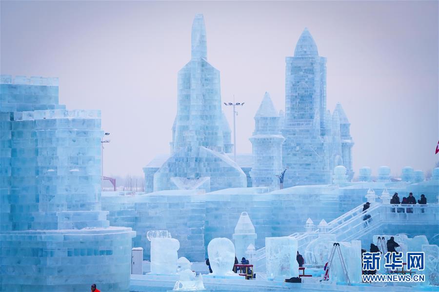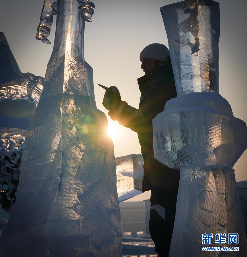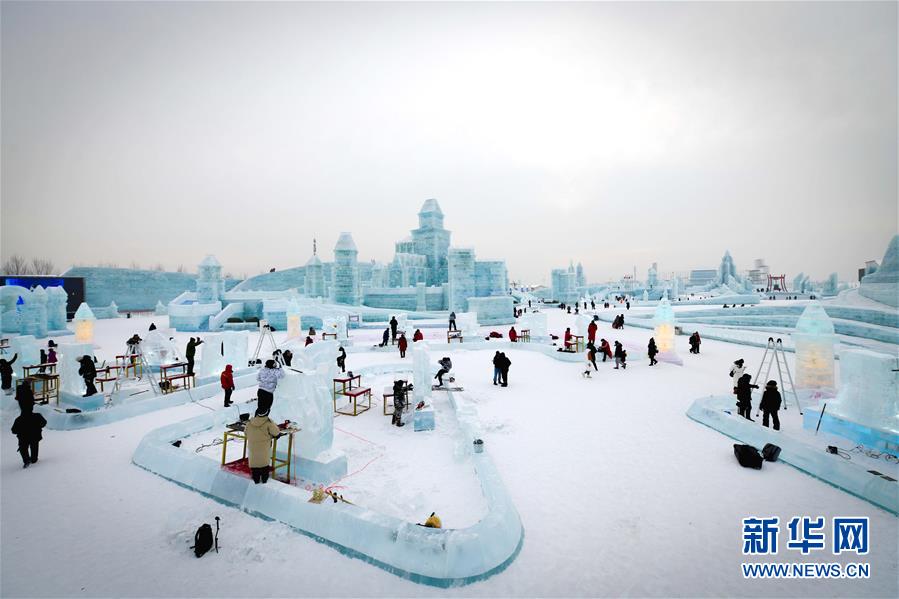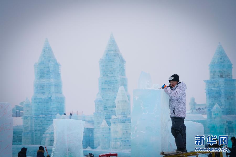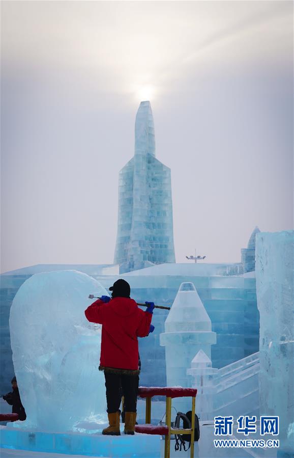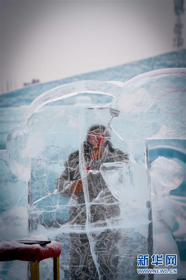 第九屆中國·哈爾濱國際組合冰雕比賽選手在哈爾濱冰雪大世界內制作冰雕(1月2日攝)。新華社記者王松攝