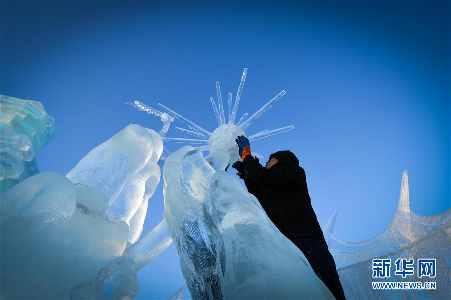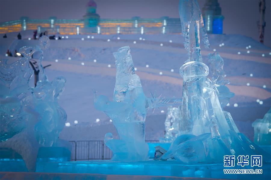 冰雕師在哈爾濱冰雪大世界內雕刻出主題各異的冰雕作品(1月8日攝)。新華社記者王松攝