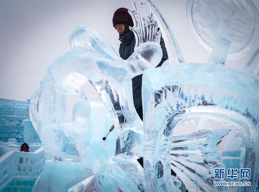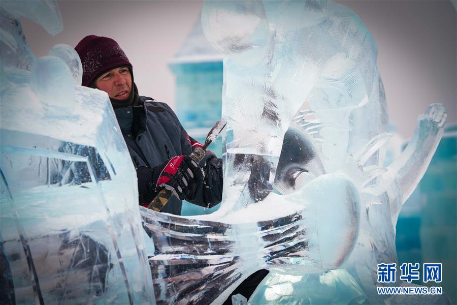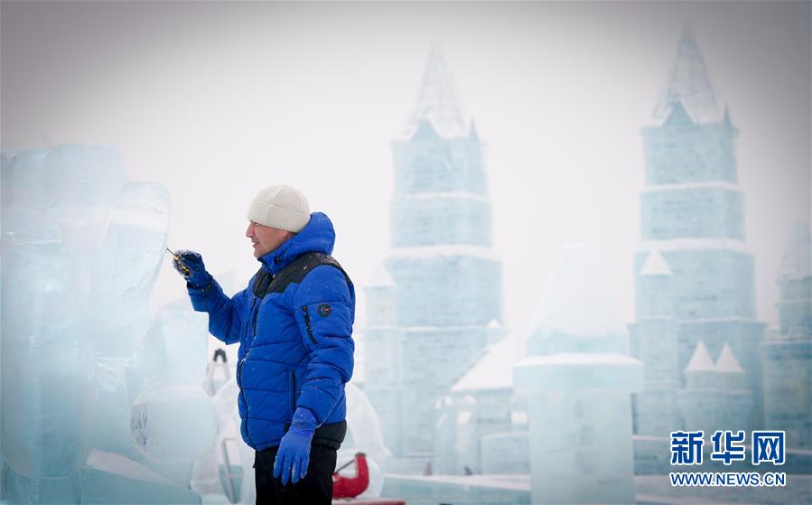 冰雕師在哈爾濱冰雪大世界內雕刻冰雕作品(1月8日攝)。新華社記者王松攝