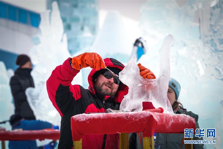 冰雕師在哈爾濱冰雪大世界內雕刻冰雕作品(1月8日攝)。新華社記者王松攝