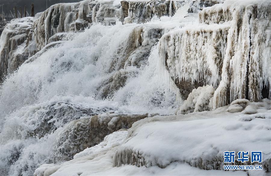 1月12日,陜西黃河壺口瀑布景區(qū)內(nèi)的冰瀑與流動(dòng)的瀑布形成一幅壯麗的圖畫。新華社記者陶明攝