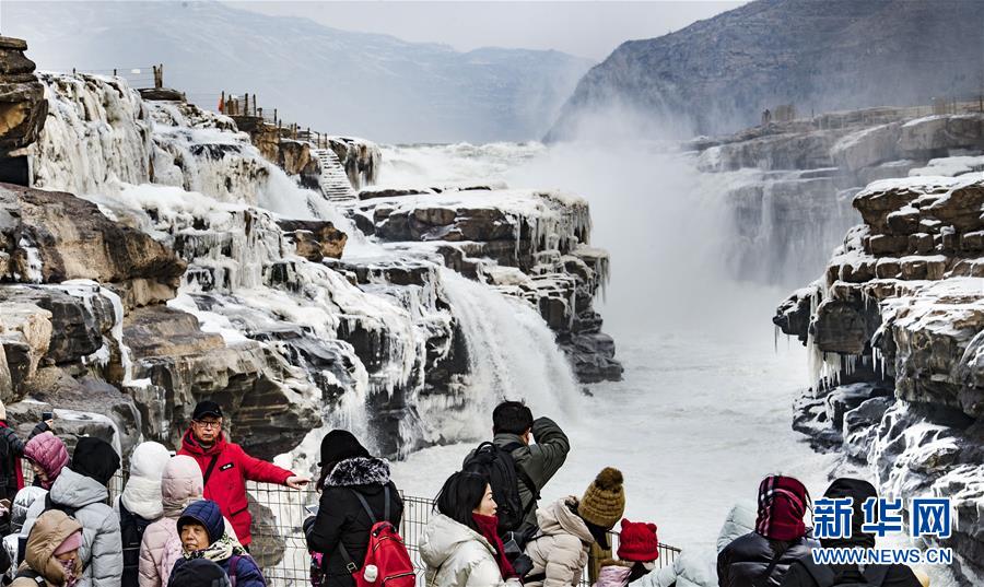 1月12日,游人在陜西黃河壺口瀑布景區內游覽。新華社記者陶明攝
