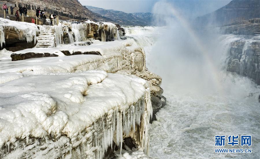 1月12日,冰雪下的黃河壺口瀑布在晨光中顯現一道美麗的彩虹(無人機照片)。新華社記者陶明攝