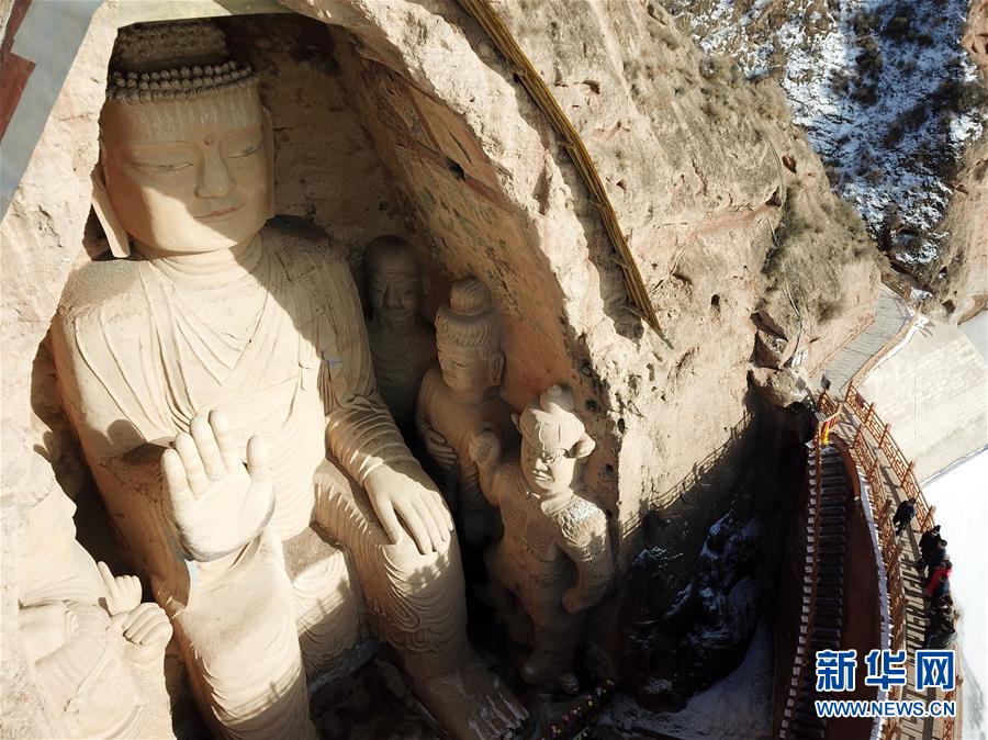1月11日,游客在參觀天梯山石窟13號窟(無人機照片)。新華社記者馬寧攝