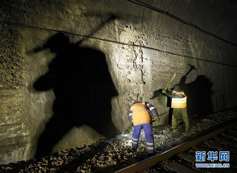 1月7日,在加格達奇工務段西羅奇嶺二號隧道,西羅奇維修工隊工作人員進行隧道除冰作業。新華社記者王毓國攝