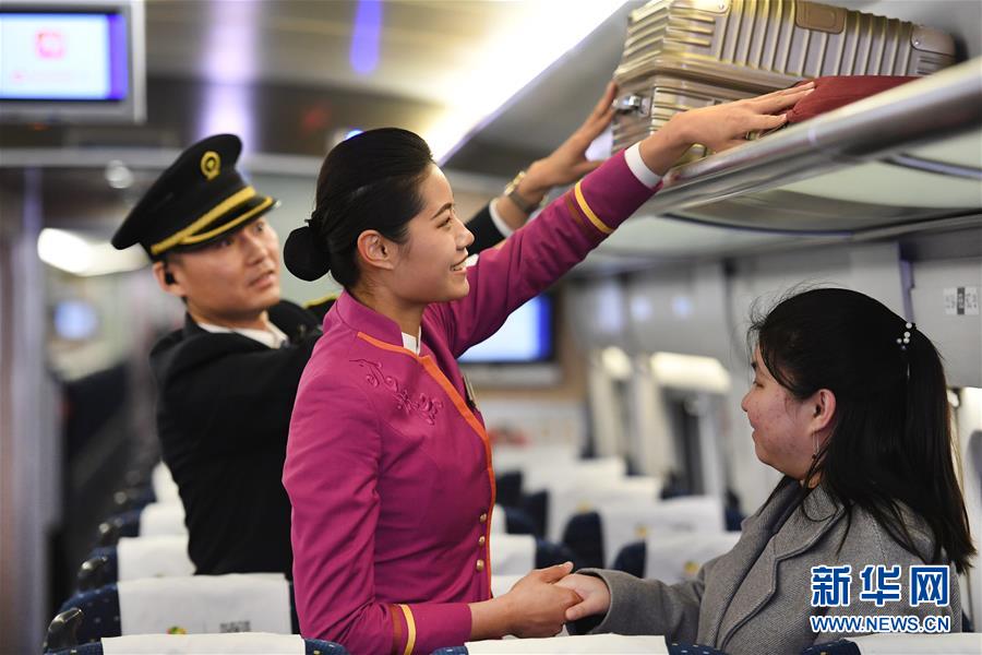 吉如(左)將盲人旅客吳瀟護送上車后,與列車長進行交接(1月15日攝)。 新華社記者 陶明 攝