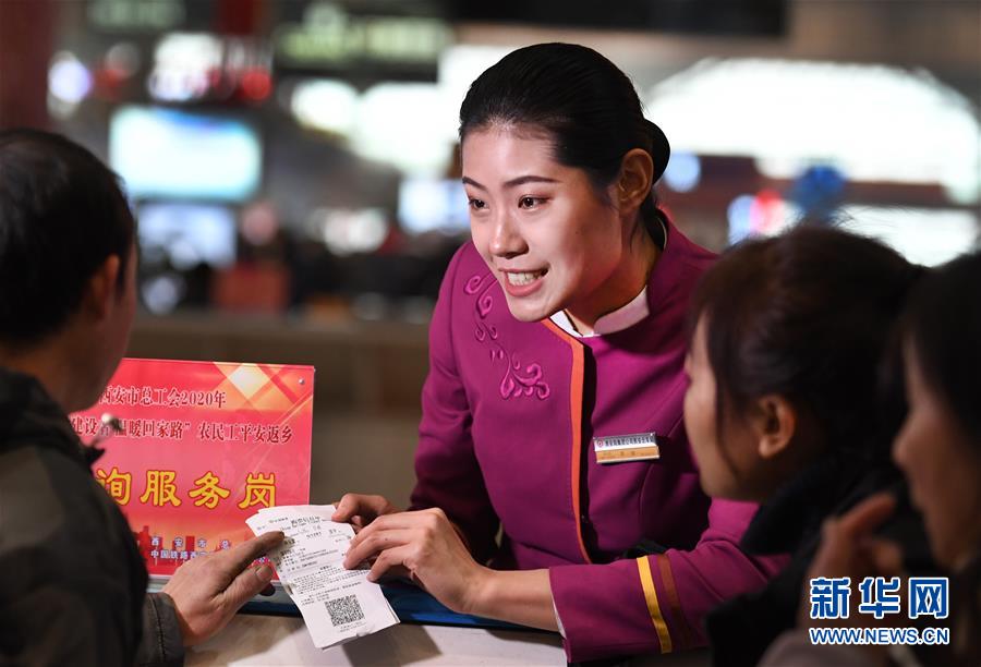 吉如在西安北站咨詢服務臺解答旅客的問題(1月15日攝)。 新華社記者 陶明 攝