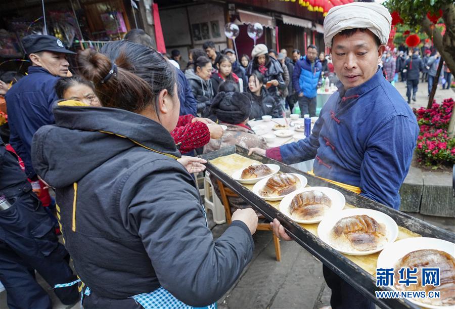 1月18日,在中山古鎮的“千米長宴”上,民間藝人用古鎮傳統“打盆”絕藝給游客們上菜。當日中午,伴隨著一聲“開席嘍”,一年一度的“千米長宴”在重慶市江津區中山古鎮舉行。噴香的煙熏豆腐、軟糯的夾燒肉、可口的石板糍粑……800余桌年味十足的特色美食,吸引了兩萬多名游客前來體驗傳統民俗,感受“一雙筷子吃遍一條街”的暢快淋漓。中山古鎮自古就有“千米匯長宴萬人祈福祉”的習俗。每年春節期間,古鎮老街居民都會在千米長街上大擺“百家宴”,祝福生意興隆、家業興旺、風調雨順、五谷豐登。新華社記者劉潺攝