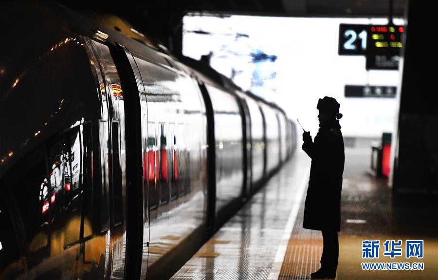 吉如在西安北站站臺上,與檢票口客運人員聯控(1月14日攝)。今年春運列車開行密度大,站臺崗位人員緊張,吉如時常被調到站臺進行站臺服務工作。新華社記者陶明攝