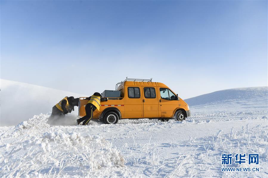 1月13日,車輛在途中打滑,白音庫倫綜合維修車間的職工推車前行。新華社記者劉磊攝