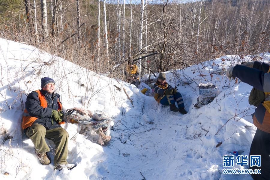 1月8日,西羅奇維修工隊工作人員在作業現場坐在雪地上臨時休息。新華社記者才揚攝