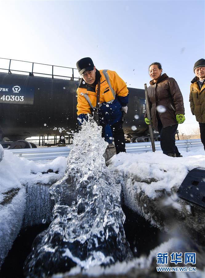 送水員黃衛東調整輸水管位置,將水注入火炬溝乘降點的蓄水井內(1月17日攝)。新華社記者許暢攝