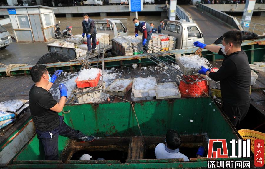 2020年2月24日,浙江舟山國際水產城碼頭,當地的工人正在剛靠岸的漁船上卸魚貨,現場十分繁忙。