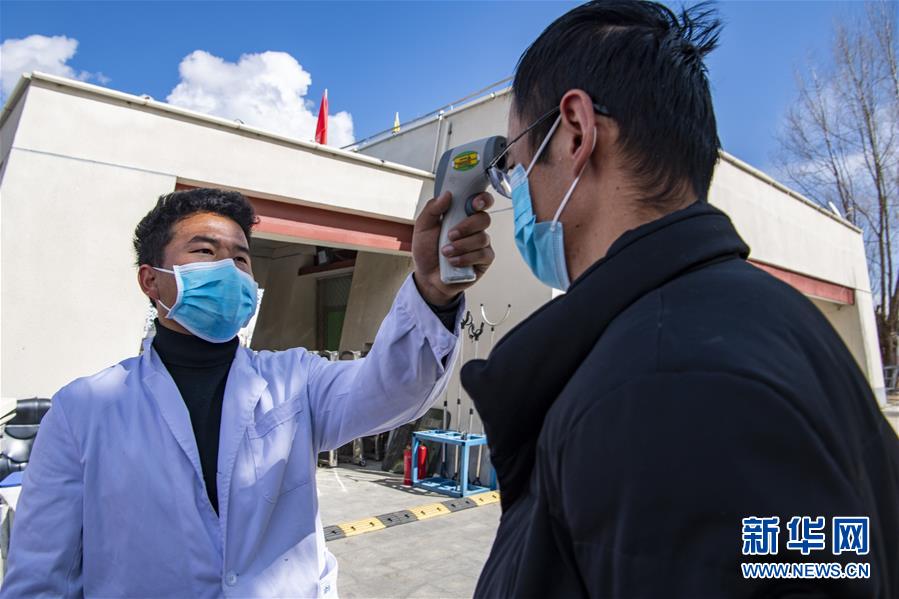 西藏大學醫學院預防專業本科生次成郎加(左)在學校門口為來校者測量體溫(2月23日攝)。新華社記者孫非攝