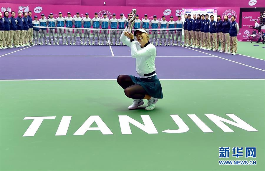 圖為2017年10月15日,莎拉波娃在2017年WTA天津網球公開賽單打決賽中戰勝白俄羅斯選手薩巴倫卡,獲得冠軍。 新華社記者岳月偉攝