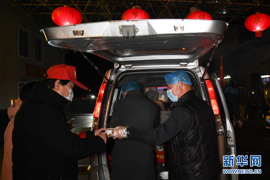2月29日晚,侄子張士洋(右一)將張蘭英做好的宵夜送給疫情防控人員。新華社記者張端攝
