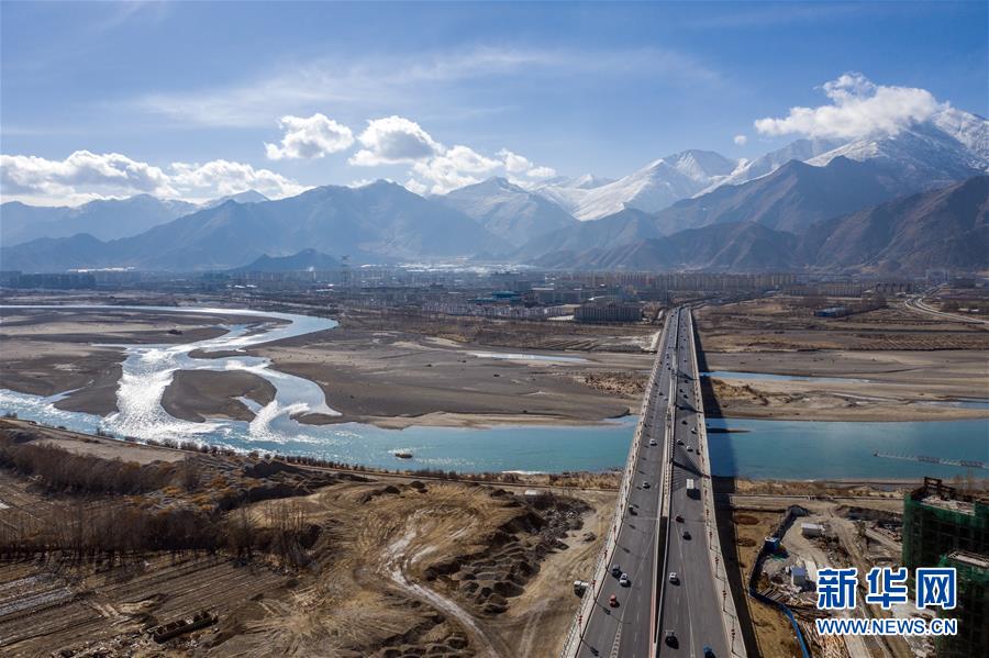 鳥瞰拉薩納金大橋(4月3日無人機拍攝)。新華社記者晉美多吉攝