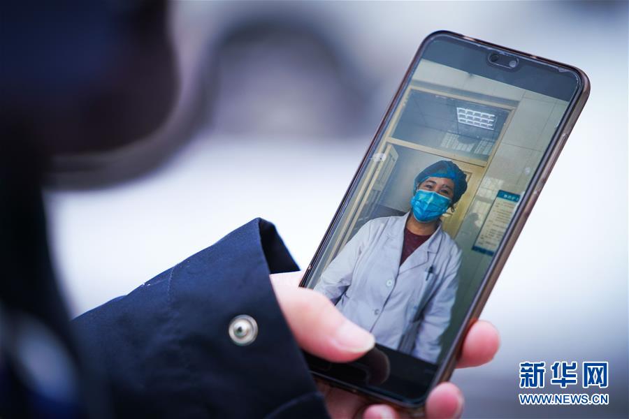李可心展示手機里母親王晶的工作照(3月1日攝)。母親王晶是一名醫生,疫情期間在留觀病房工作。 新華社記者王松攝