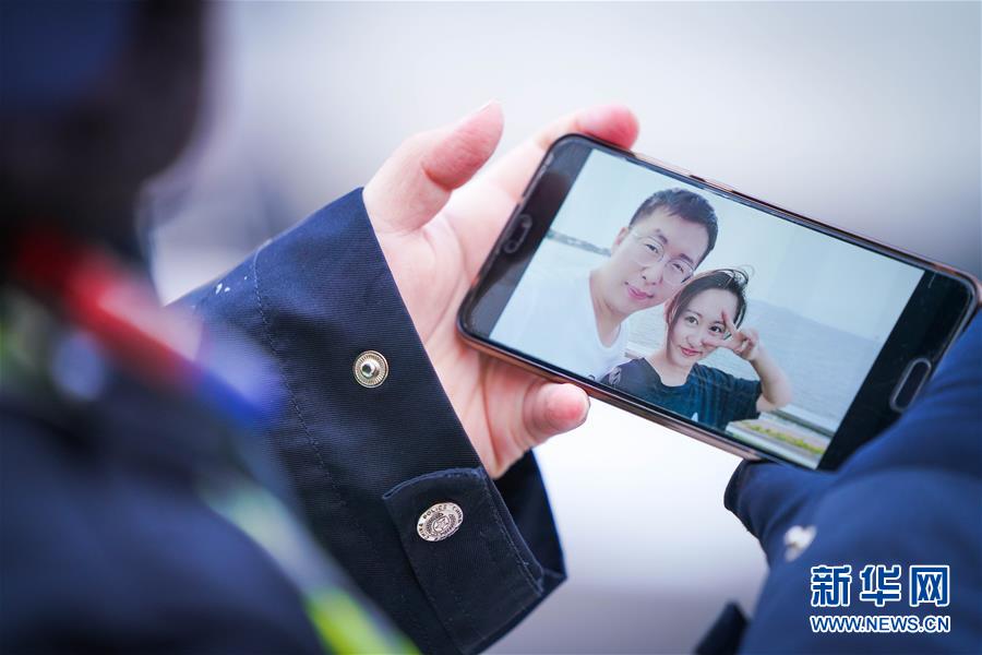 李可心展示手機里父親李論的工作照(3月1日攝)。父親李論是一名民警,負責對轄區內疑似感染人員居住小區進行封控、排查工作。新華社記者王松攝