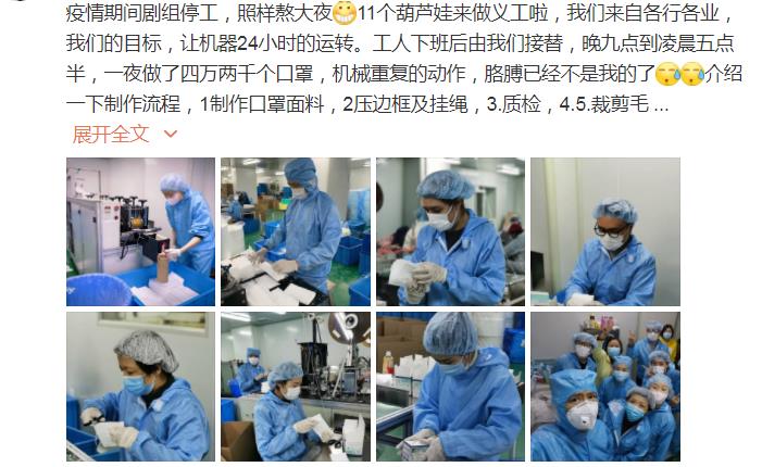 微博上,高鑫寫道:“疫情期間劇組停工,照樣熬大夜。11個葫蘆娃來做義工啦,我們的目標,讓機器24小時運轉。工人下班后由我們接替,晚九點到凌晨五點半,一夜做了42000個口罩,機械重復的動作,胳膊已經不是我的了。”微博上他還介紹了做口罩的流程,圖文并茂,十分“走心”。
