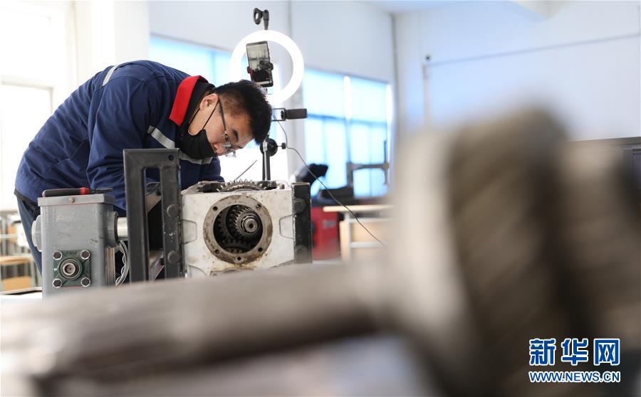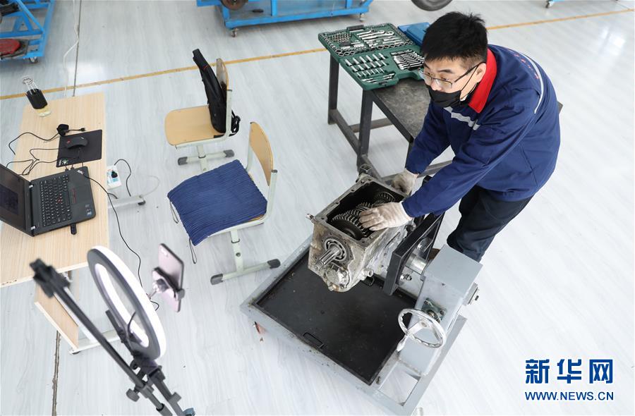 3月4日,職教城內的鞍山市交通運輸學校的高峰老師為學生進行變速器檢修實訓網絡授課。遼寧省鞍山市職教城內的各類職業教育學校從3月2日恢復網絡授課以來,教師們設置了豐富多彩的課程,提高1萬余名學生線上學習的積極性。新華社記者姚劍鋒 攝