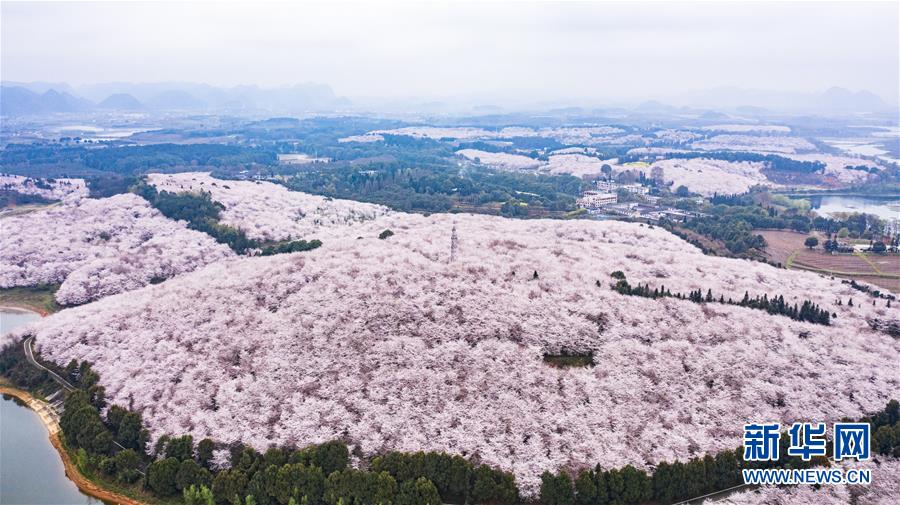 3月12日拍攝的貴安新區櫻花觀光園風景(無人機照片)。 近日,貴州省貴安新區櫻花觀光園內櫻花競相盛開,花團錦簇間春意盎然。據介紹,疫情防控期間,為避免人群聚集,櫻花園暫不接待游客。 新華社記者 陶亮 攝