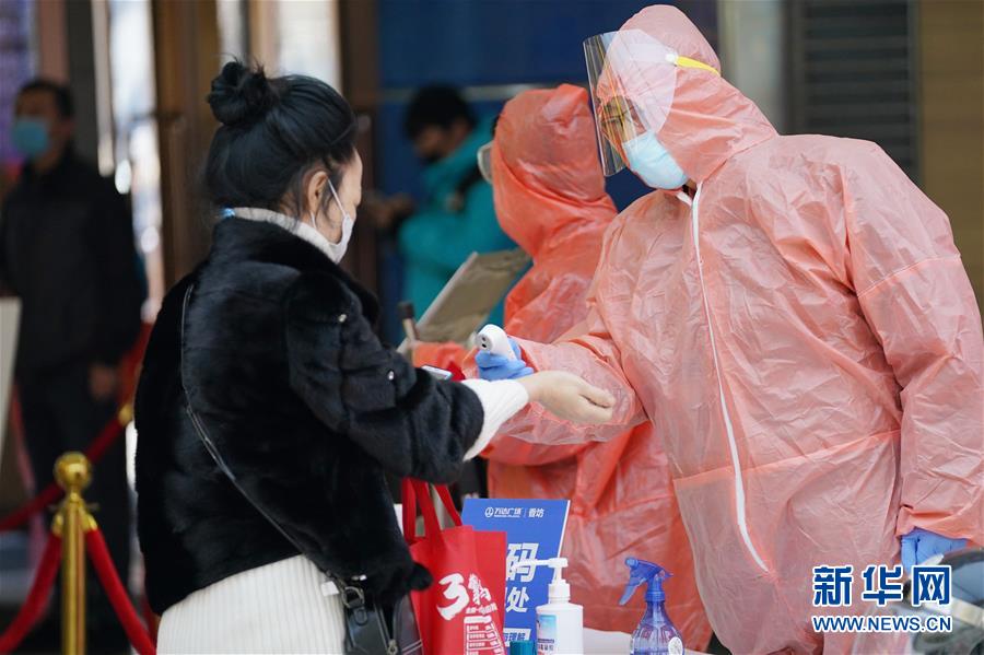 3月13日,在哈爾濱香坊萬達廣場內,工作人員在給進店顧客測體溫。 近日,哈爾濱市多家大型商場陸續恢復營業。這些恢復營業的商場采取多種措施,從嚴細致做好疫情防控和安全風險防范工作,為廣大顧客提供安全放心的購物空間。 新華社記者 王建威 攝