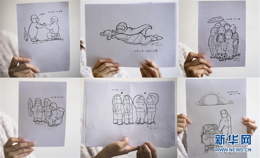3月13日,黎婧展示自己在疫情期間創作的插畫(拼版照片)。 3月12日,插畫師黎婧和84位病友離開自己居住的武漢軟件工程職業學院康復驛站,回到自己家中。他們都是治愈出院的新冠病毒肺炎患者,已經在武漢軟件工程職業學院康復驛站進行了14天醫學觀察,達到醫學標準,成功解除隔離。他們由專車運送至所屬社區附近的集散點后,在社區工作人員的陪同下回家。 新華社記者 肖藝九 攝