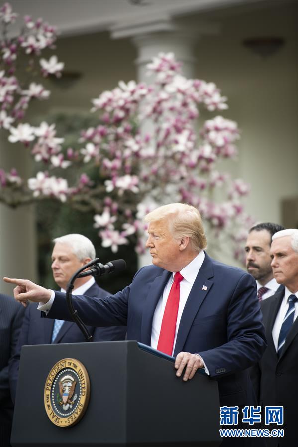 3月13日,美國總統(tǒng)特朗普(中)在華盛頓白宮的記者會上講話。特朗普當天下午在白宮發(fā)表講話時正式宣布“國家緊急狀態(tài)”。他說,此舉旨在讓美國聯(lián)邦政府全力投入到抗擊新冠肺炎疫情的努力中。這項舉措將釋放500億美元資金,幫助各州和地方政府應對疫情。新華社記者劉杰攝