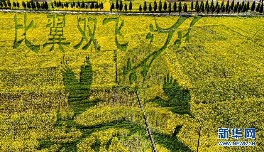 3月14日拍攝的洋縣紙坊街道龍山觀花點創意種植的“相守一生”油菜花景觀(無人機照片)。 新華社記者陶明攝