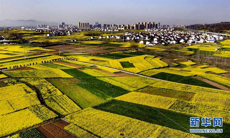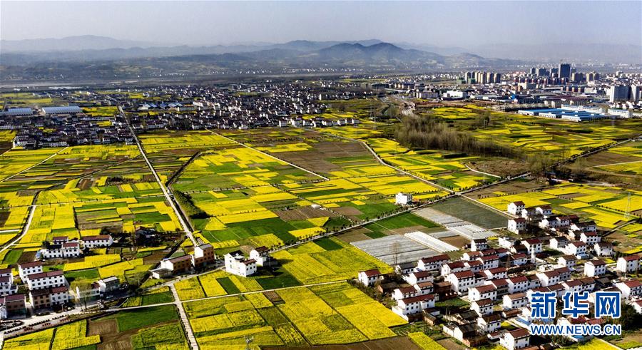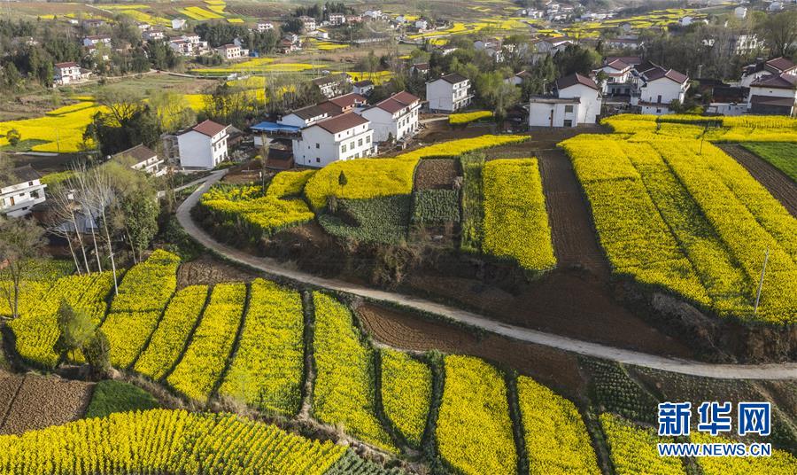 3月14日,洋縣龍亭鎮柳山村盛開的油菜花與村舍構成美麗的圖畫(無人機照片)。 新華社記者陶明攝