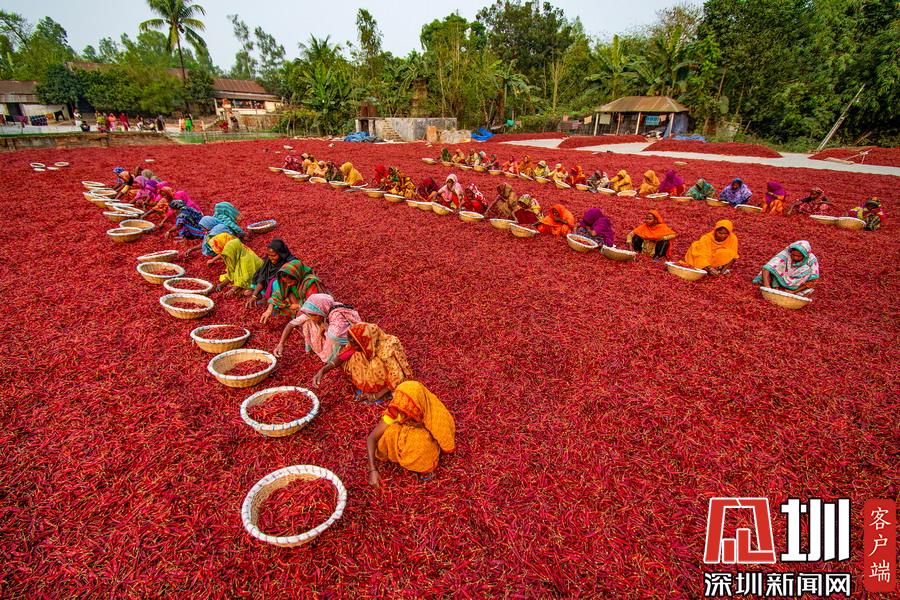 航拍孟加拉國工人分揀辣椒 滿眼火紅大地如鋪上地毯