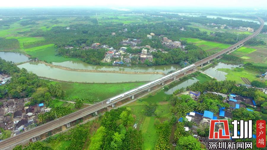 2020年3月17日,海南環島鐵路一列動車從春光明媚的瓊海城區經過。