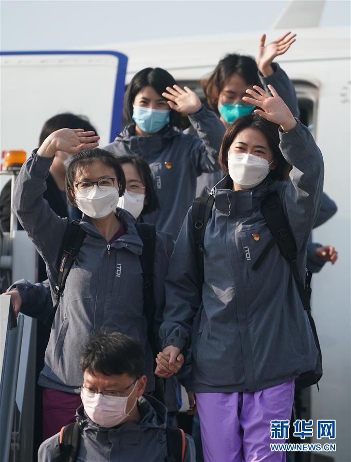 3月17日,抵達陜西西安的醫療隊隊員向前來迎接的人員揮手致意。新華社記者李一博攝