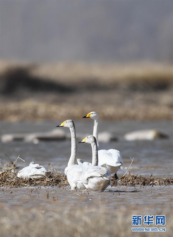 3月18日,候鳥在準格爾旗大路鎮的黃河淺灘上棲息。 新華社記者 劉磊 攝