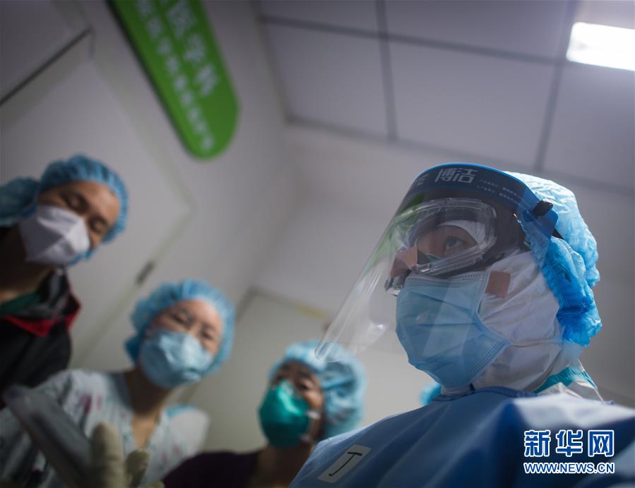3月19日,在武漢市肺科醫院,浙江醫療隊隊員丁楊(右)準備步入重癥監護室。 新華社記者 肖藝九 攝