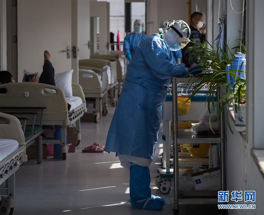 3月19日,在武漢市肺科醫院隔離病房,內蒙古醫療隊隊員陳亮在現場忙碌。 新華社記者 肖藝九 攝