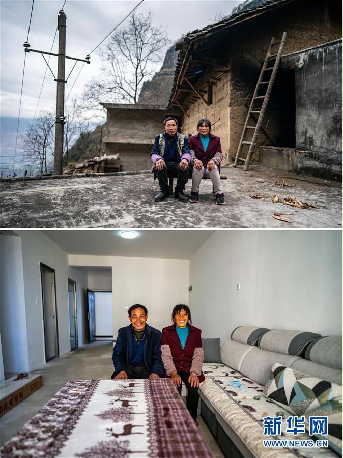 這是一張拼版照片:上圖為云南省永善縣大興鎮駱丘村村民王大香和丈夫晏付高在生活了二十多年的老屋前合影(3月14日攝);下圖為王大香和丈夫晏付高在新家家中合影(3月15日攝)。