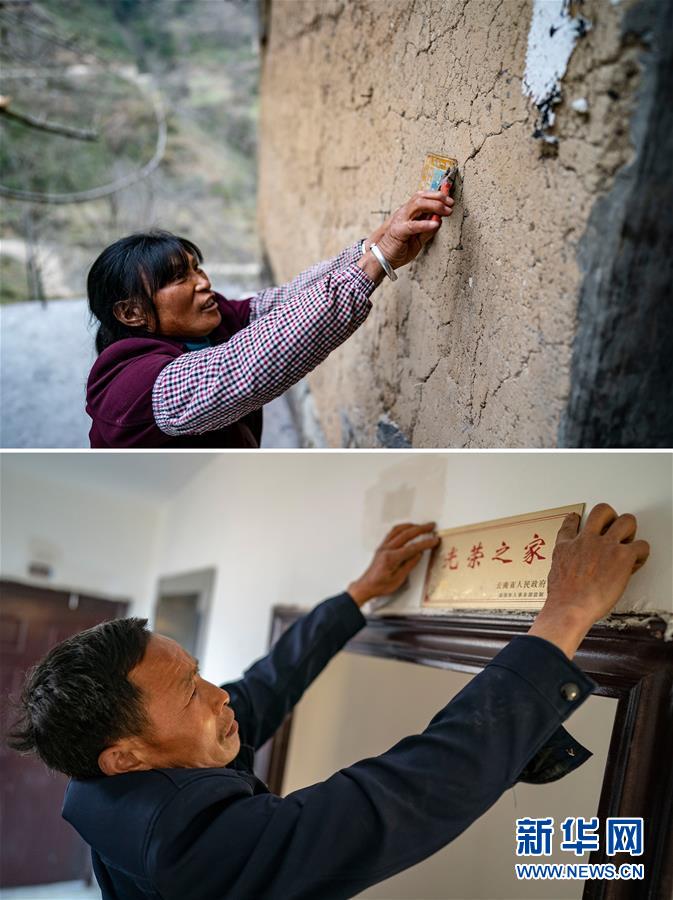 這是一張拼版照片:上圖為云南省永善縣大興鎮駱丘村村民王大香拆下老屋的門牌留作紀念(3月14日攝);下圖是作為現役軍人家屬的晏付高把“光榮之家”的牌匾掛在新家的門上(3月15日攝)。 新華社記者 江文耀 攝
