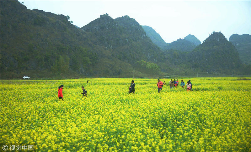 2019年2月5日,廣西來(lái)賓,當(dāng)天是農(nóng)歷大年初一,人們?cè)谛贸强h城關(guān)鎮(zhèn)隆光村油菜花海中賞花游玩。