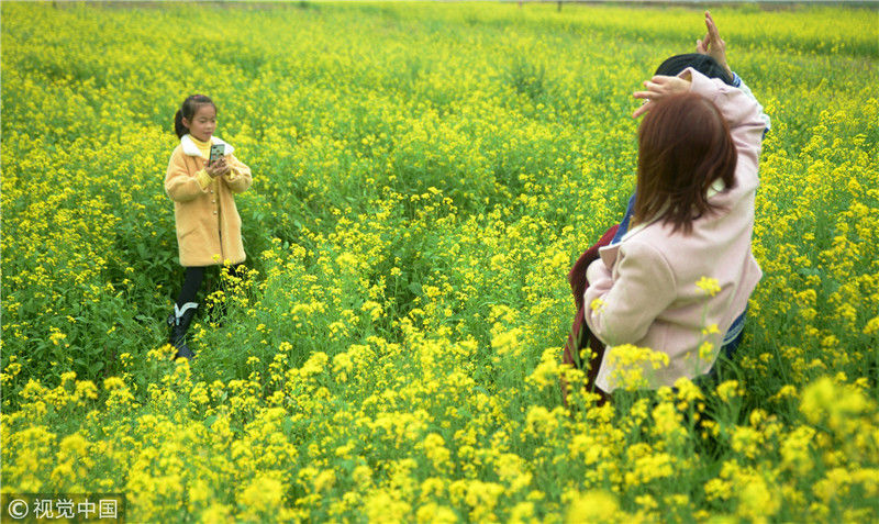 2019年2月5日,廣西來賓,當天是農歷大年初一,人們在忻城縣城關鎮隆光村油菜花海中賞花游玩。