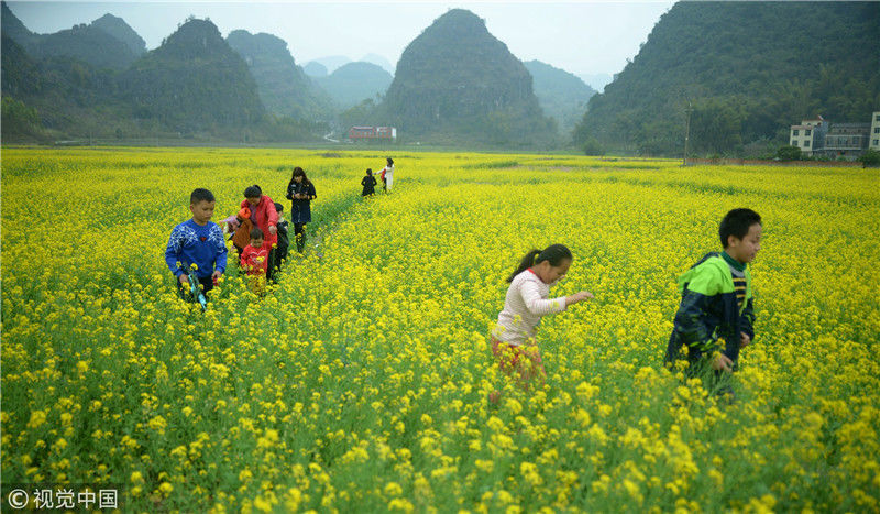 2019年2月5日,廣西來賓,當天是農歷大年初一,人們在忻城縣城關鎮隆光村油菜花海中賞花游玩。