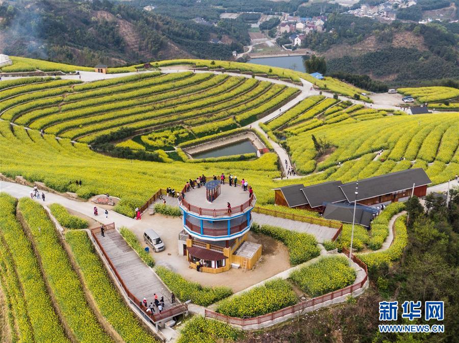 3月25日,游客在新登鎮上旺村黑山頂觀景臺觀賞油菜花海(無人機照片)。新華社記者徐昱攝