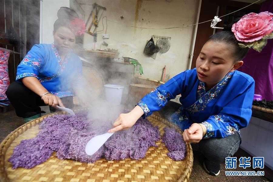 4月17日,在貴州省臺江縣姊妹街哆蝶五彩姊妹飯體驗店,苗家婦女在攤晾五彩“姊妹飯”。新華社記者楊文斌攝