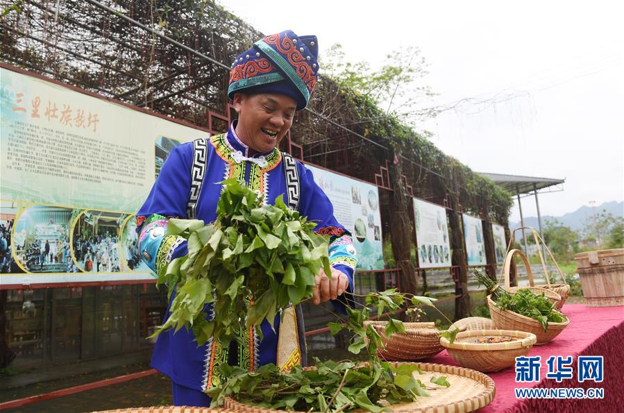 3月25日,在廣西上林縣巷賢鎮,一名壯族村民在準備做五色糯米飯。新華社記者陸波岸攝