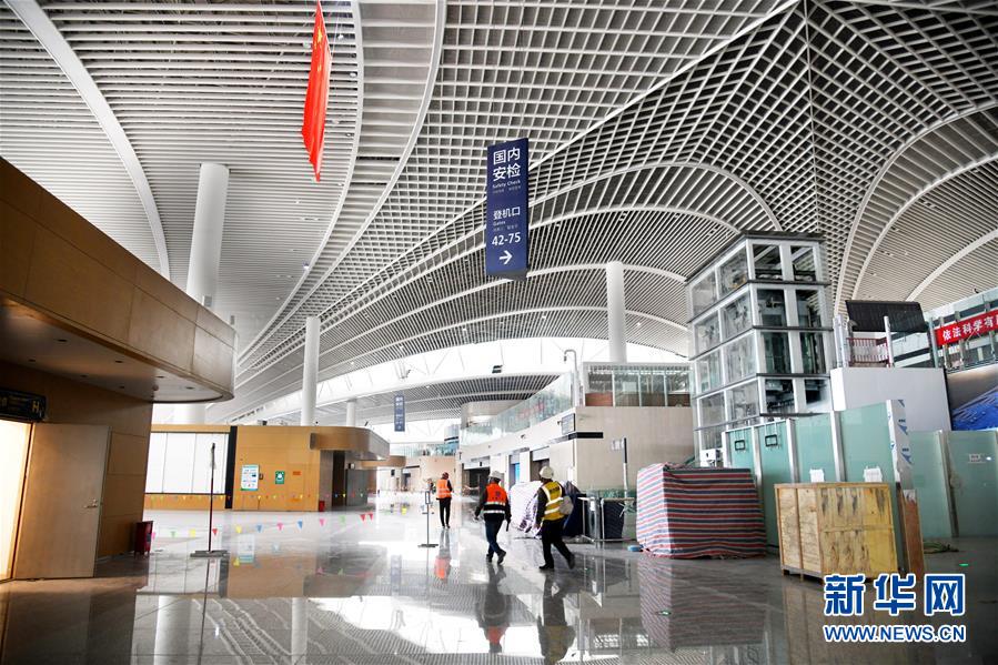 3月25日,幾名工人從建設中的青島膠東國際機場航站樓出發大廳走過。新華社記者李紫恒攝