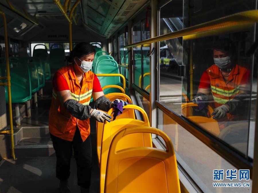 3月23日,武漢公交集團站務公司保潔員趙真香在清潔518路公交車。新華社記者沈伯韓攝