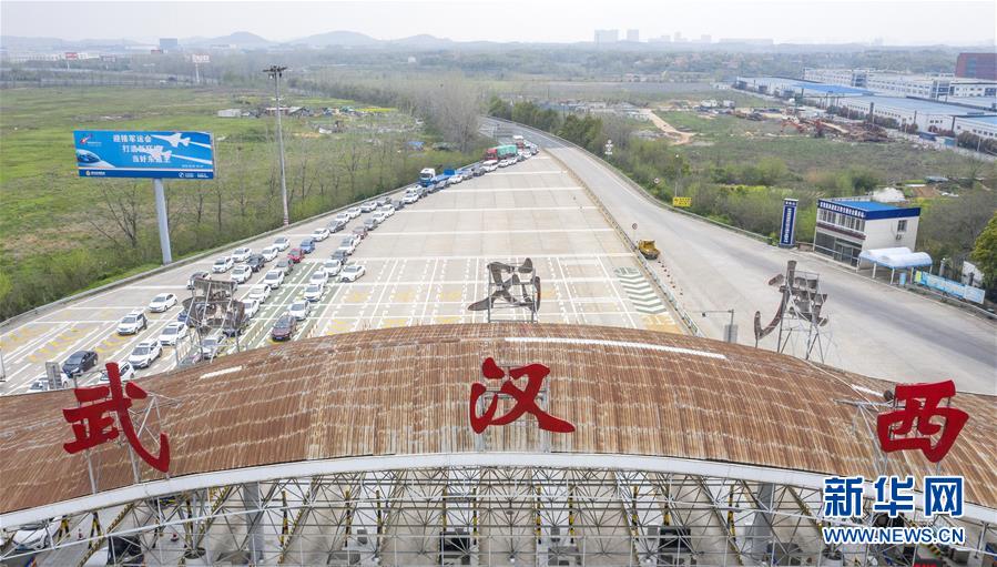 3月24日,在武漢西高速收費站交通卡點,返漢車輛排隊等候入城(無人機照片)。當日,湖北省新冠肺炎疫情防控指揮部發布通告說,湖北省除武漢市以外地區,將于3月25日起解除離鄂通道管控,武漢市將于4月8日起解除離漢離鄂通道管控措施。隨著近日武漢部分企業逐漸復產復工,進入武漢的返城務工人員陸續增多,車輛在武漢西高速收費站交通卡點有序排隊返回武漢。工作人員對返城人員檢查體溫,并核查證明健康的“綠碼”和身份證后放行。新華社記者才揚攝