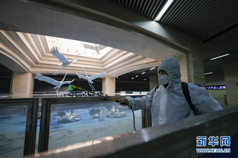 3月23日,在漢口火車站地鐵站,保潔人員在為站廳乘客通道消毒。目前,武漢城市功能和市民生活正逐步有序恢復,地鐵、公交車系統已啟動全面消殺和張貼乘客健康二維碼識別等舉措,為恢復運營做準備。新華社記者沈伯韓攝