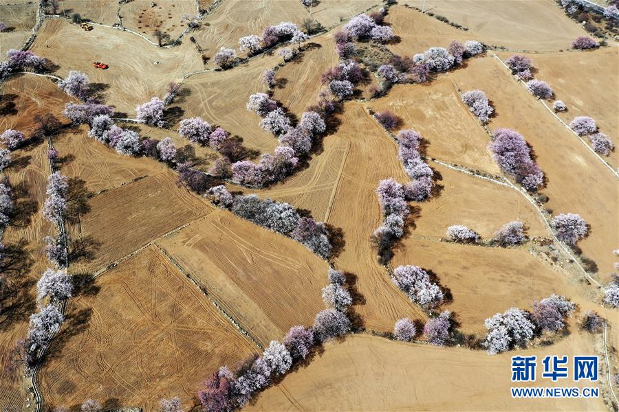 西藏林芝市波密縣境內桃花盛開的田園風光(無人機照片,3月26日攝)。新華社記者 詹彥 攝